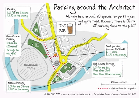 The parking at the Architect is free for patrons of the pub. Customers are entitled to 3-hours free parking but ensure your registration is recorded at the bar upon arrival. Full T&C's are displayed in the car park.